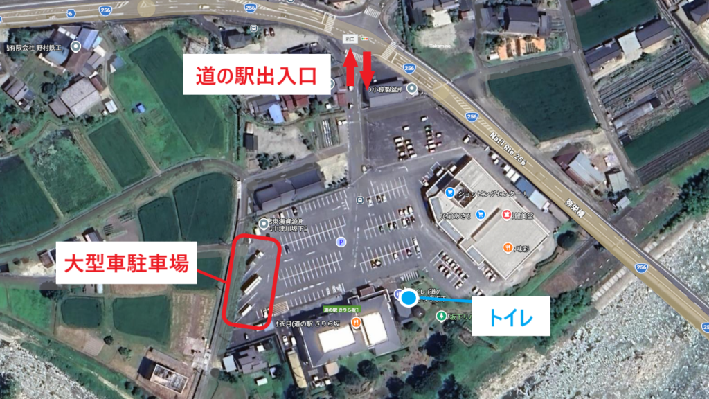 自車をショッピングセンターまたはトイレの建物付近に駐車した場合は、大型車のアイドリングの影響をほとんど受けることなく車中泊することができます。