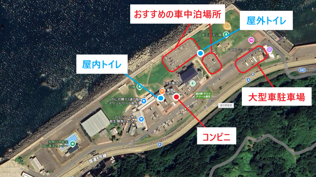 道の駅マリンドリーム能生(のう)は、新潟県糸魚川市の国道8号線沿いにある道の駅です。かにや横丁や海産物市場が人気のスポットですが、駐車場438台と広大で、車中泊スポットとしても優秀です。