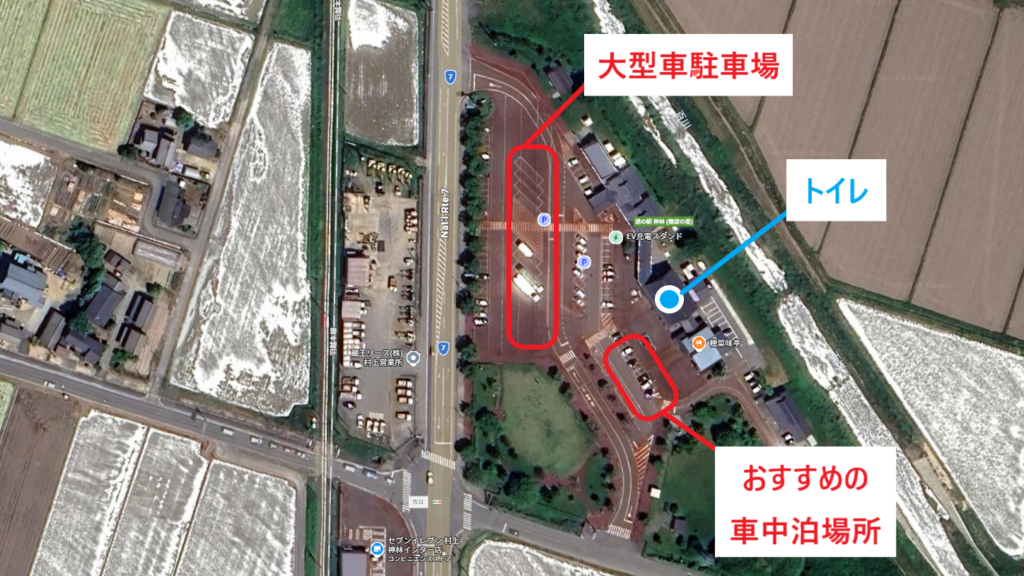 結論:道路から距離があり、大型車とも離れて駐車しやすく、快適に車中泊することができる。