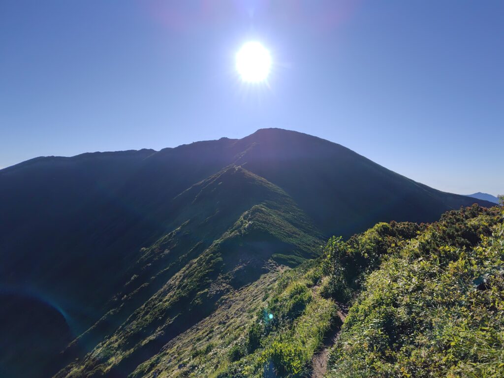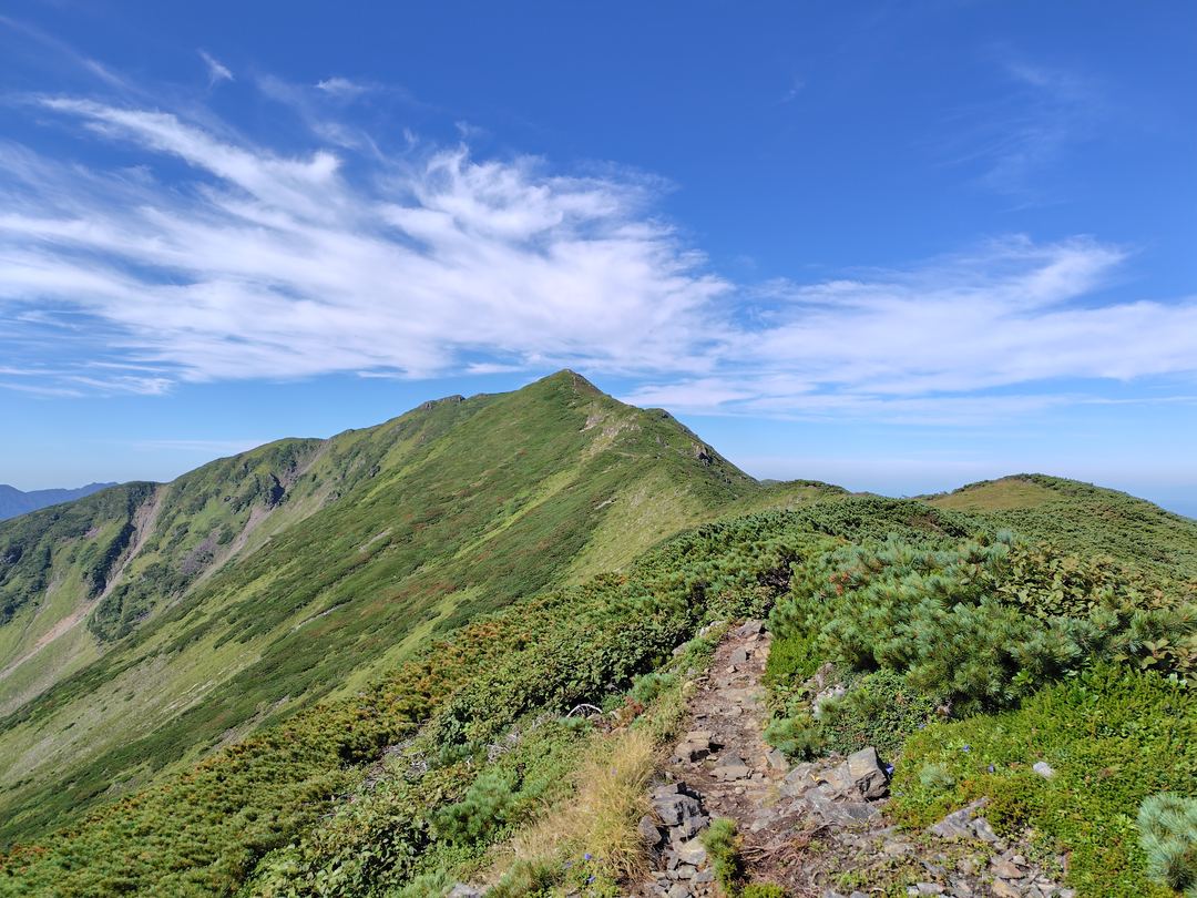 戸蔦別岳の山頂から見る幌尻岳の堂々たる山容は圧巻で、いったん300m近く下ってから再び登り返す本コース最大の難所が待ち構えます。