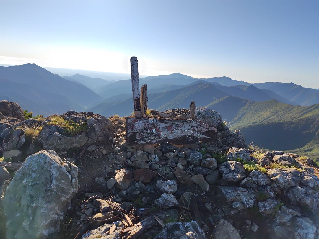 長い急登を登り切り、登山開始から2時間半で最初のピークであるヌカビラ岳(1,808m)に到着です。今までの樹林帯がウソかのように一気に視界が広がります