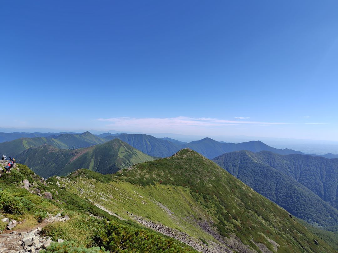 30分ほどで北戸蔦別岳(1,912m)に到着。ここからは日高山脈ならではの雄大な山並みが一望できます。