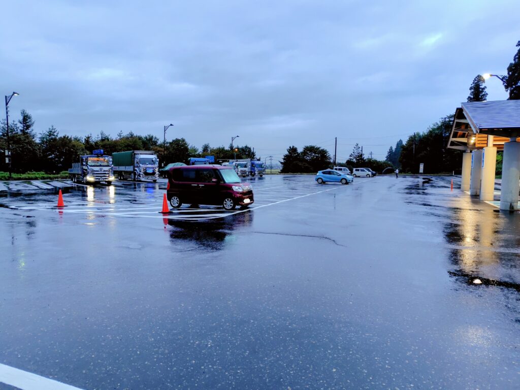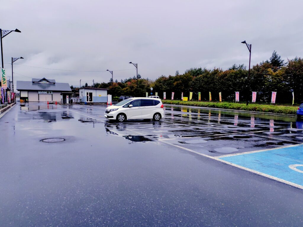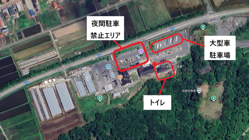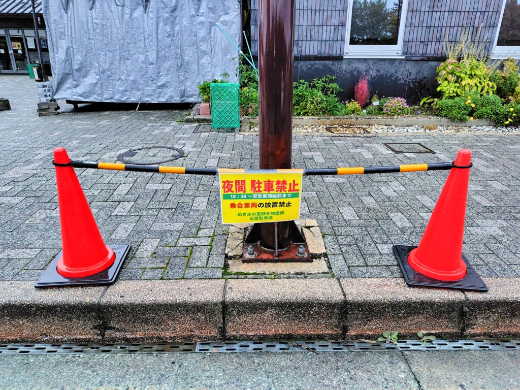 道の駅西側にある物産館の正面駐車場は、ローソンやトイレ前にある大型車駐車場から距離を取って駐車できる駐車場ですが、夜間駐車禁止の告知が至るところに掲示されています。そのため、この物産館の正面駐車場エリアで車中泊している車は少なく、多くの車はローソンやトイレ前に駐車しています。