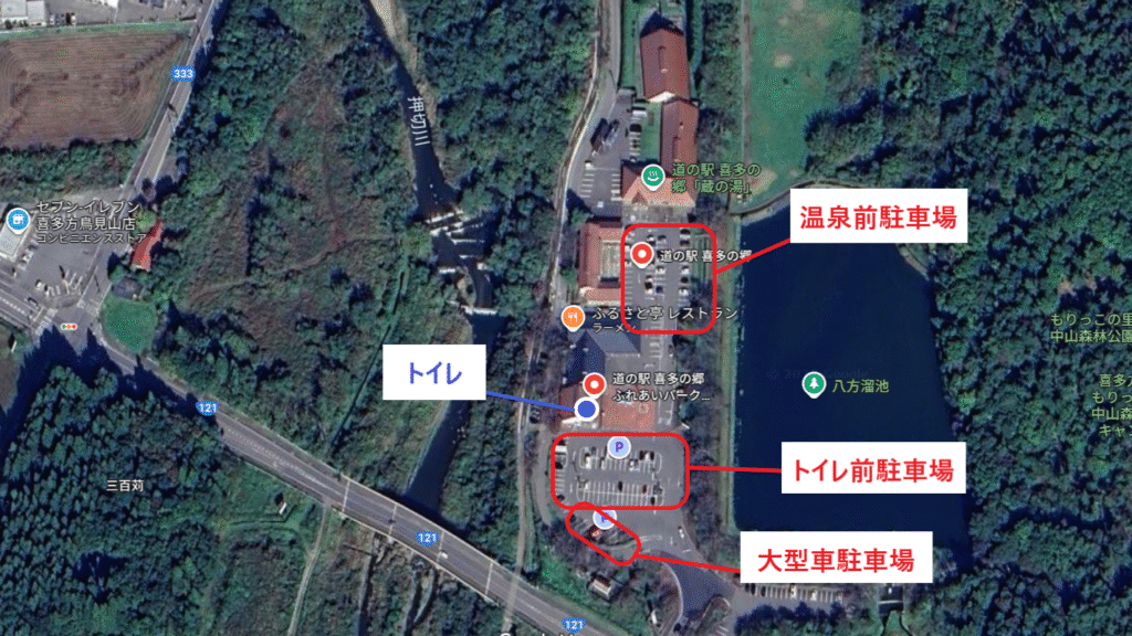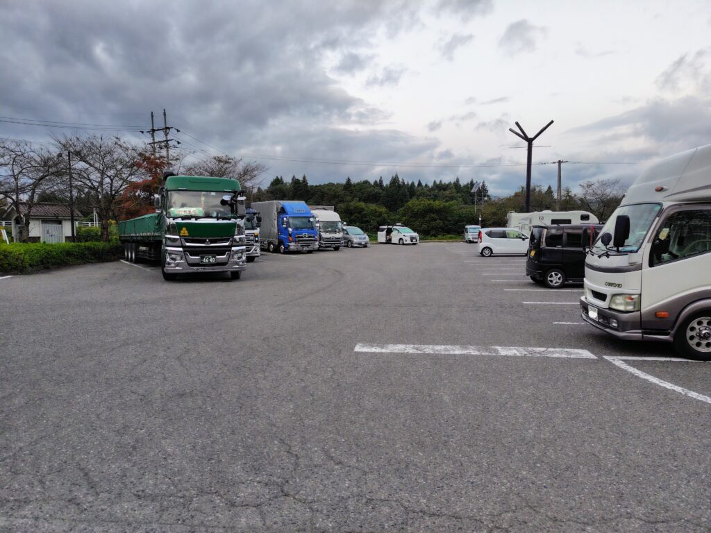 結論:隣接する道路や大型車駐車場から離れて駐車しやすい。温泉施設前の駐車場が車中泊するのにおすすめ。