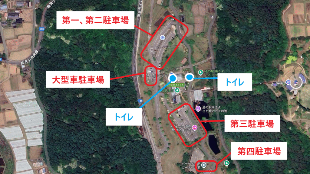 国道から道の駅に進入し、北側(建物向かって左側)に進むと第一駐車場があります。トイレに近いのが最大のメリットですが、トイレ付近には大型車駐車場が設置されていますので、大型車のアイドリングを避けるには少しトイレから離れた場所に駐車する必要があります。