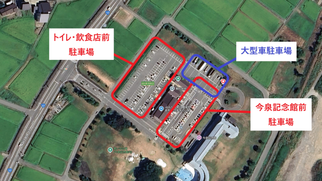 この道の駅の駐車場は大きくトイレ・飲食店(四季味わい館)前駐車場と今泉記念館前駐車場の2つのエリアに分かれています。