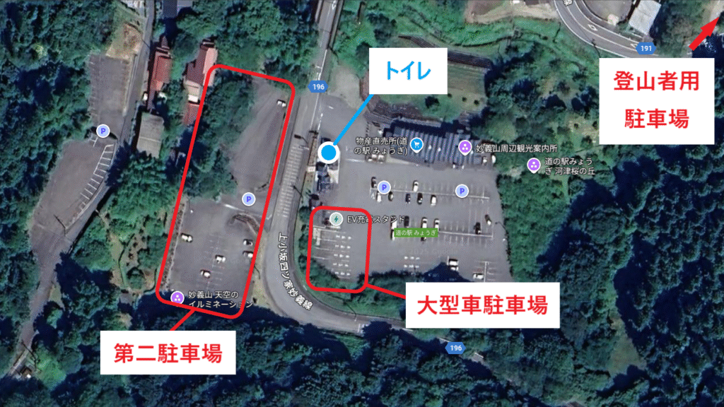 メイン駐車場の他、第二駐車場や少し離れた場所に登山者用駐車場も設置されています。第二駐車場からトイレへのアクセスも不便ではない距離ですので、メイン駐車場・第二駐車場のどちらの駐車場でも車中泊のしやすさには大きく変わりはありません。