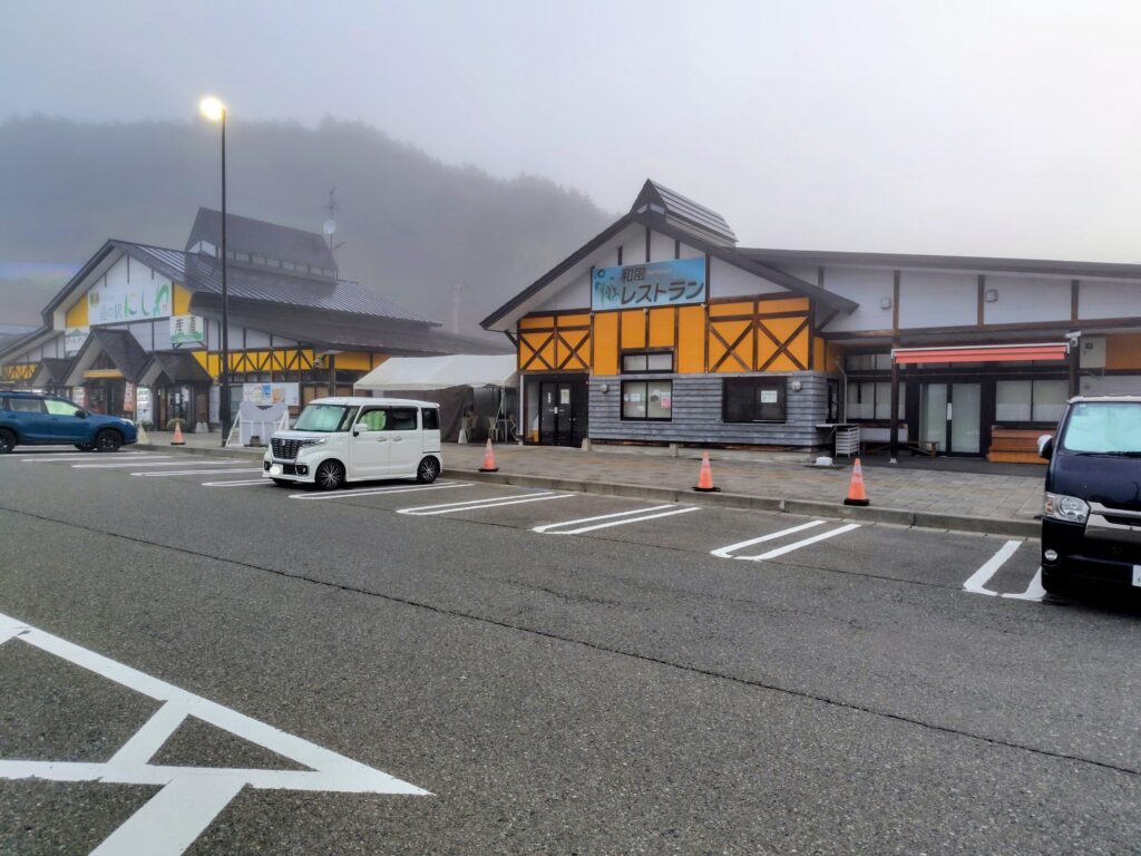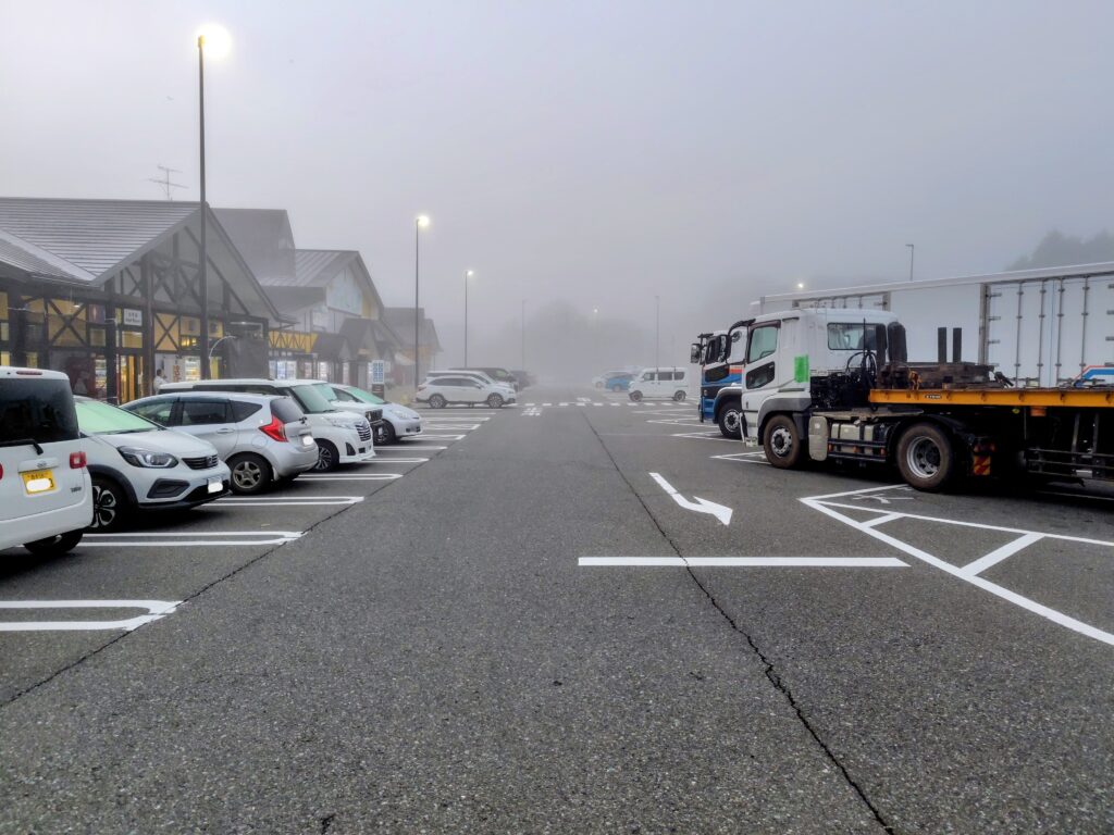 この道の駅の駐車場は、隣接する国道に沿って縦長に設置されています。道路との距離が近く、走行音の受けやすい位置関係になっています。