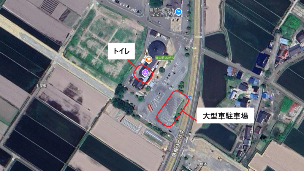 隣接する国道との距離が近く、大型車駐車場との距離も近い。騒音対策が必須で、静かに車中泊しにくい。