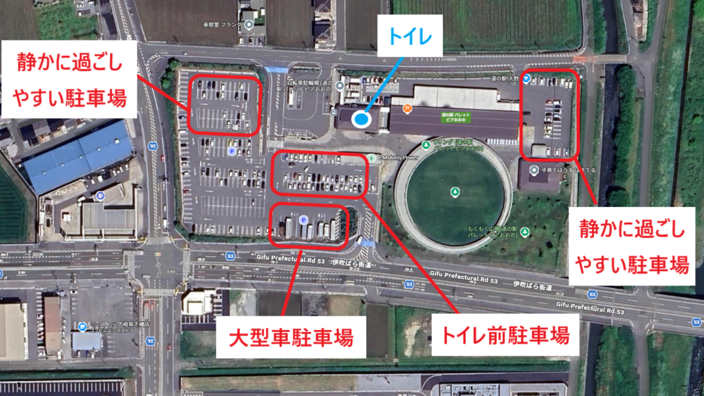 トイレに近く利便性は高いですが、大型車駐車場との距離が近く、アイドリングの影響を受けやすい位置関係です。