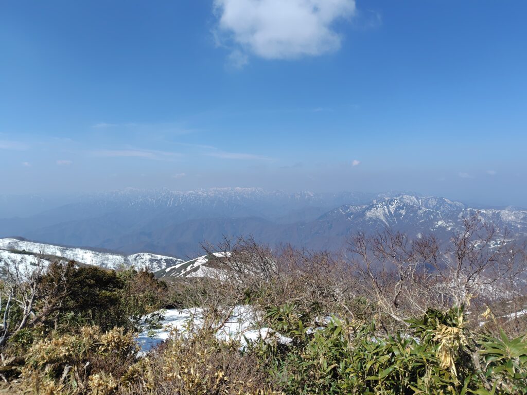 山頂からは白山や北アルプスの山並みを一望できます。