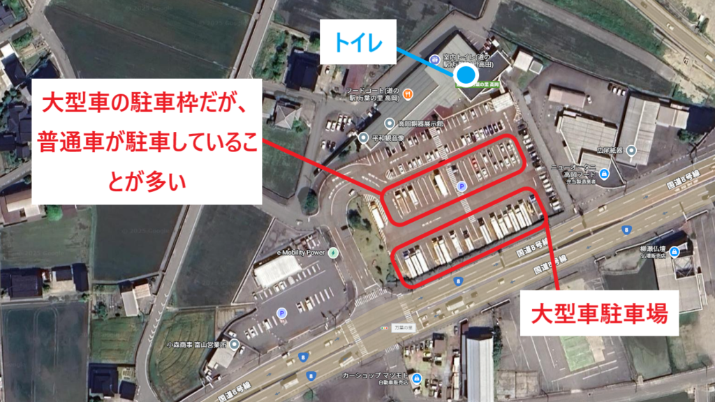 車中泊おすすめの場所は、トイレ付近の駐車場です。トイレ付近の駐車場は、大型車駐車場から最も離れて駐車することができ、アイドリング音を軽減して過ごすことが可能です。