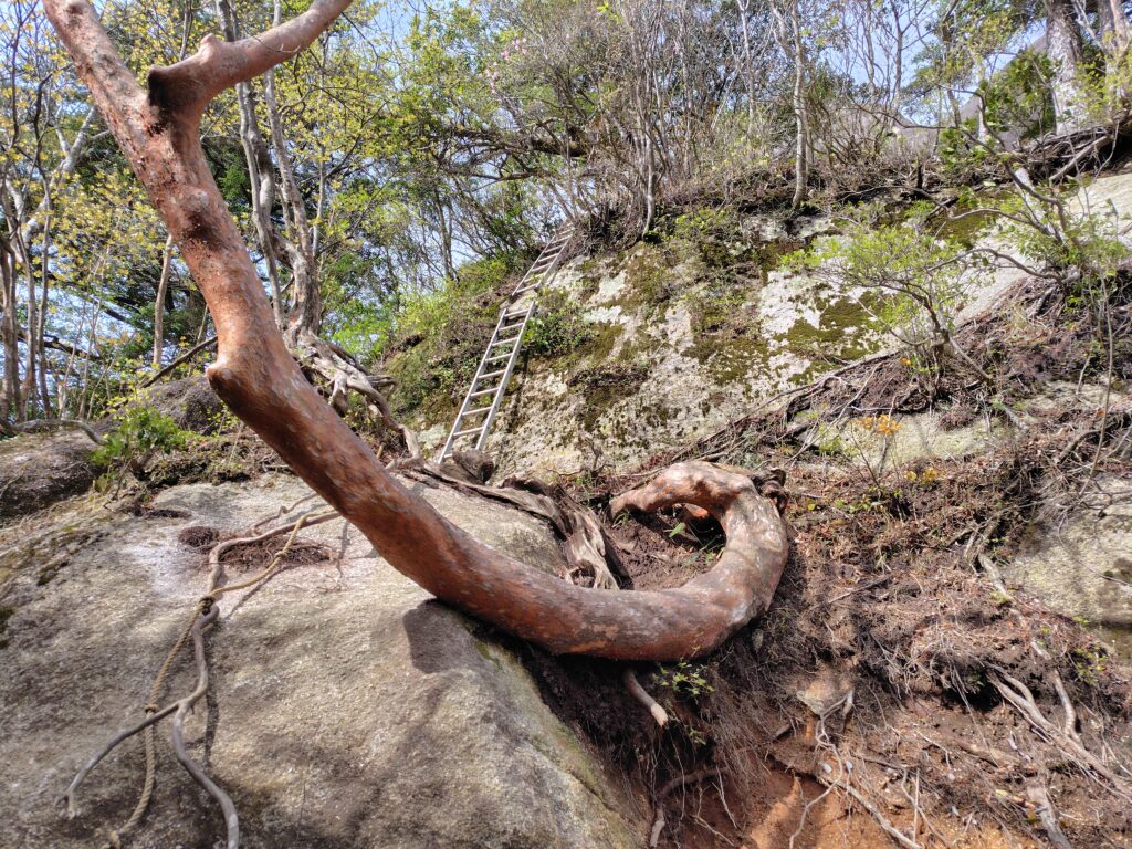 急傾斜の梯子場・ロープ場・花崗岩の一枚岩「坊主岩」の巻き道を、慎重に越えていきます。