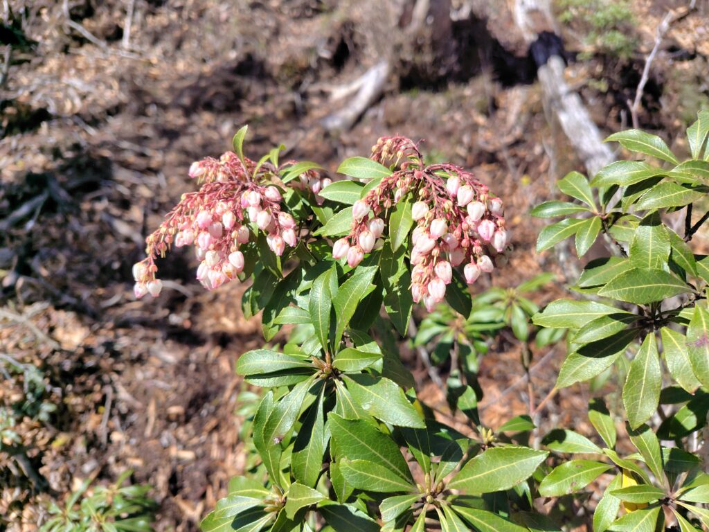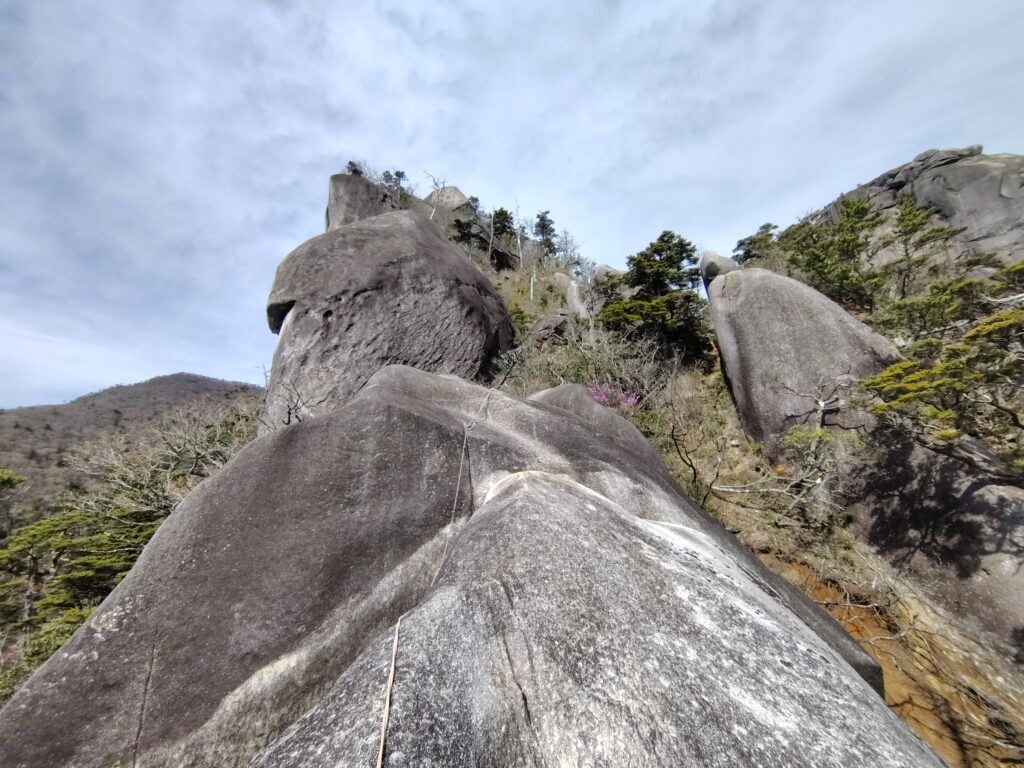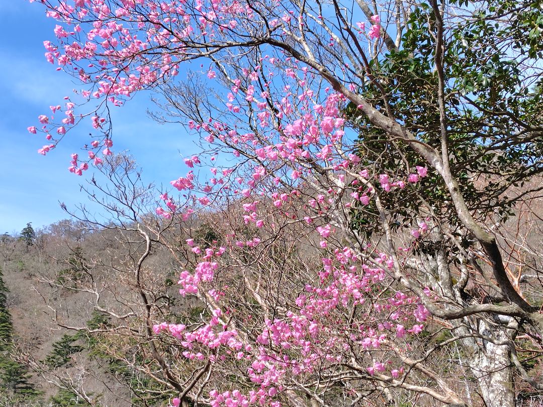 岩場を抜けると、アセビが多く茂った斜面を山頂に向けて登っていきます。4月下旬の大崩山はアケボノツツジが咲き誇り、山肌をピンクに染めます。