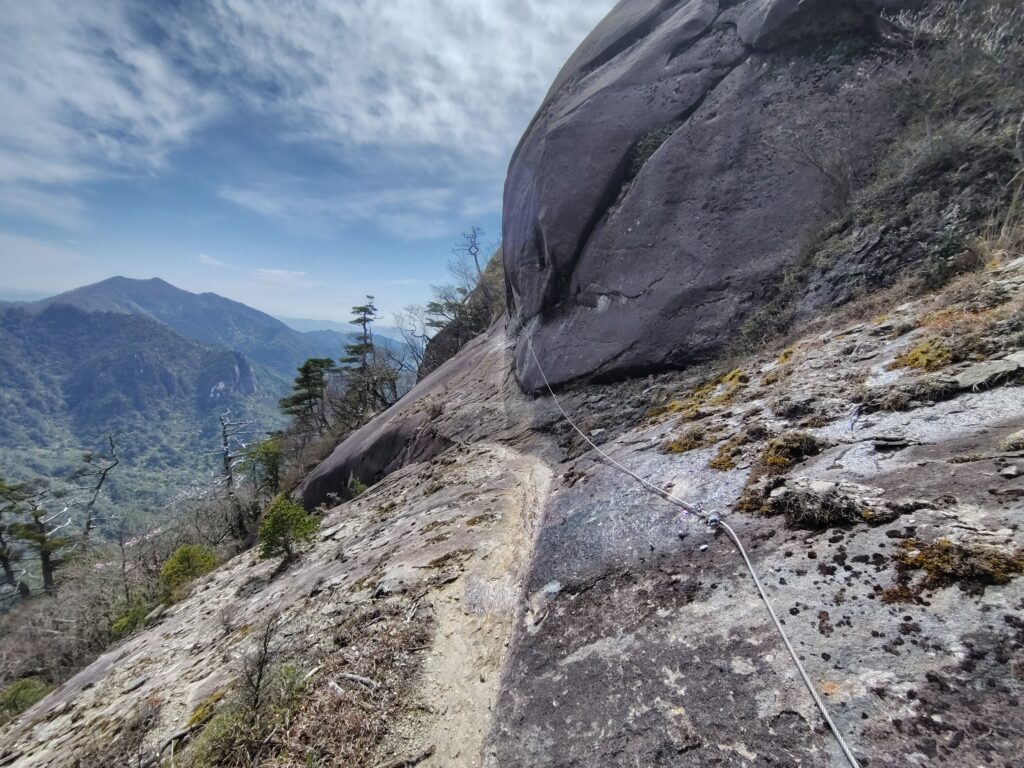 坊主岩を越えた後も、ロープやハシゴが連続。片側が切れ落ちた巨岩をワイヤーを頼りに横切っていく場所は、高度感があってかなりスリリングです。