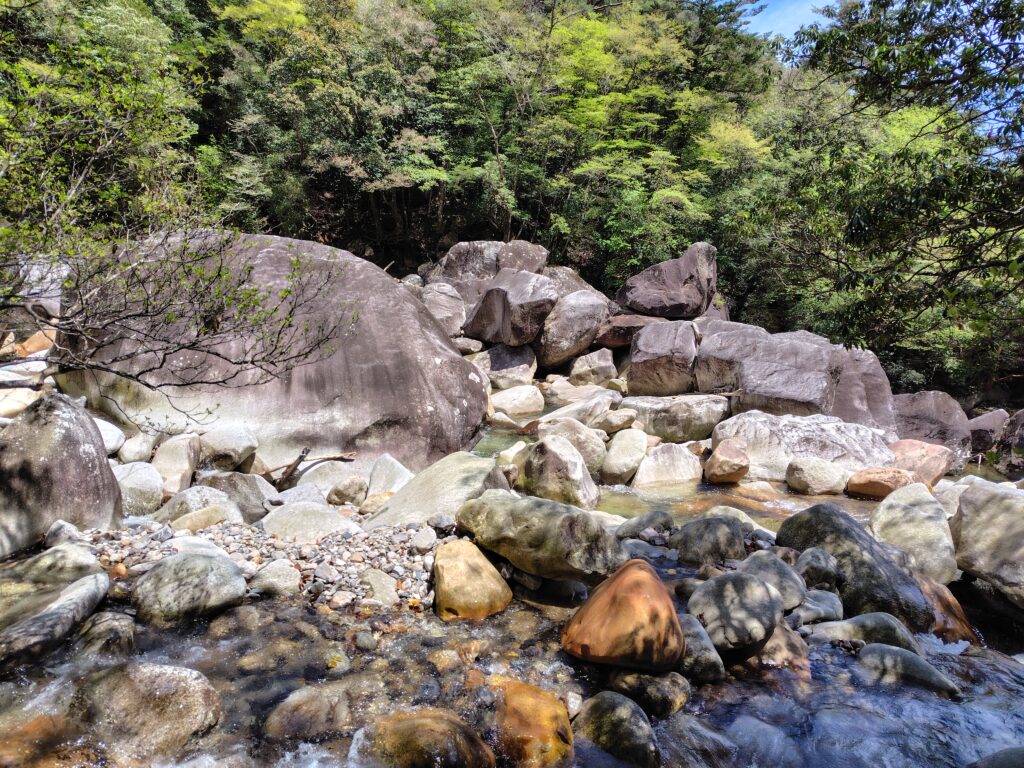 登山口からはまず樹林帯の登りとなり、祝子川(ほうりがわ)の沢沿いを進んで大崩山荘へ。