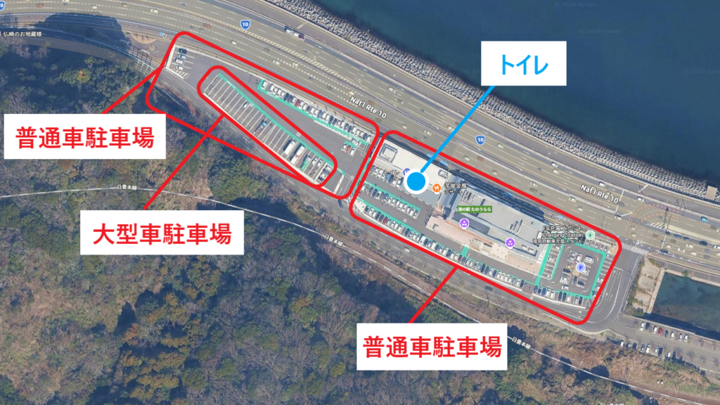 国道・側道・線路の三方向から騒音が届き、耳栓があっても浅い眠りでは起きてしまうレベル。静かに仮眠したい人には向かず、前泊先としては他の選択肢を優先したい道の駅です。