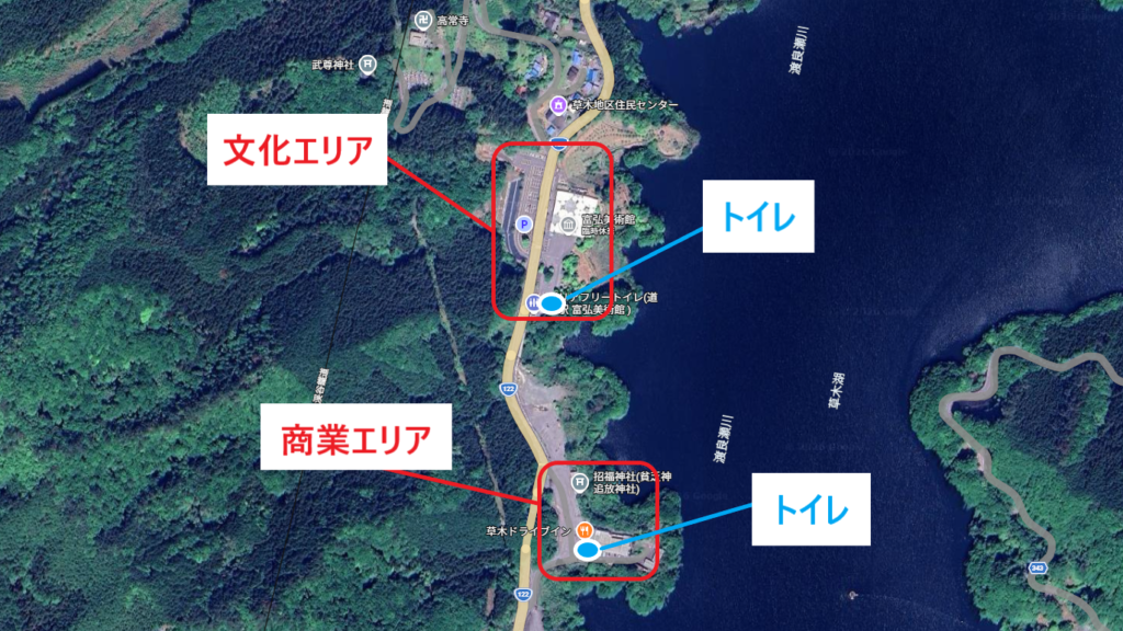 - 設備面:美術館前トイレはウォッシュレット3基/ドライブイン横は24時間トイレ(和式のみ)