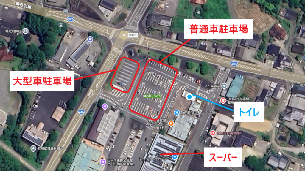 - 駐車場所:スーパー・道の駅食堂側の駐車場が道路から最も遠く、トイレも近くておすすめ