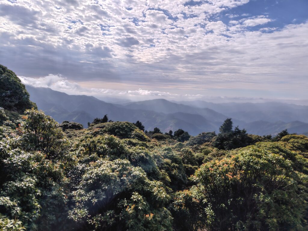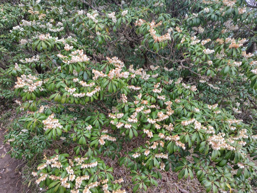 造林小屋からは傾斜のきつい樹林帯の登りとなります。標高1,300m付近からアセビを中心とした背の低い樹木に植生が変化してきます。