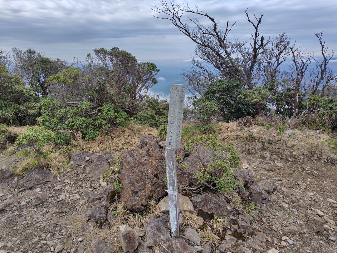 最後のひと登りで市房山の山頂(1,722m)に到着。山頂には立派な山標柱と三角点が鎮座しています。山頂からは阿蘇・国見岳を望める大パノラマが広がります。