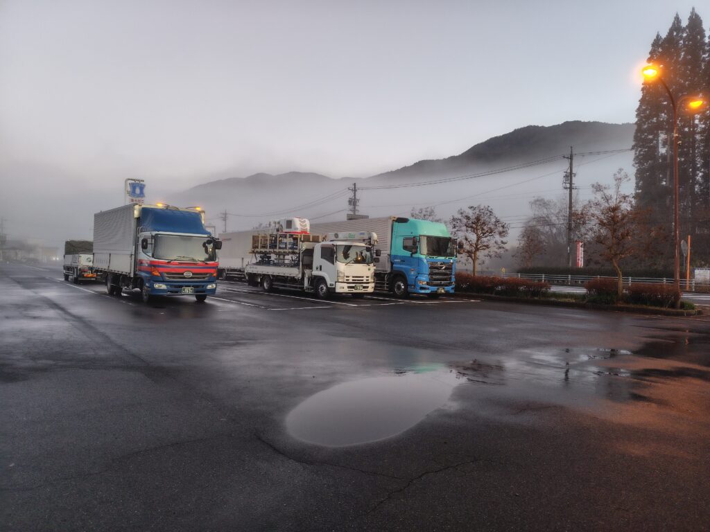 冒頭でも触れたように、どの場所に駐車しても隣接する国道との距離が近くなってしまいます。国道の交通量は夜間は少なめですが、大型車の通過が断続的に見られます。走行音の影響を強く受けてしまいますので、耳栓等の音対策は必須となります。