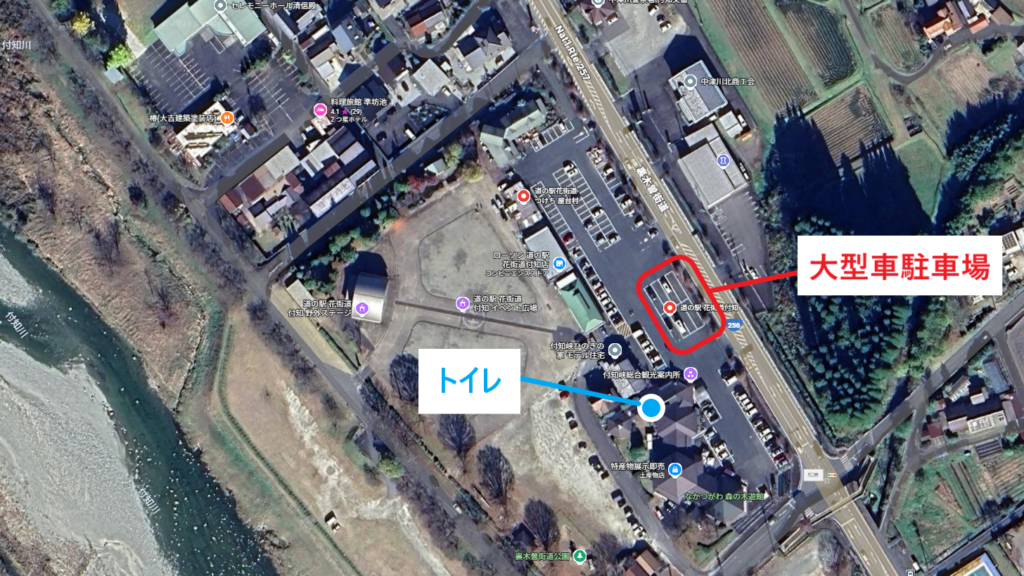 トイレ付近の駐車場は、トイレまでの距離を気にしなくていいメリットがあるものの、大型車駐車場との距離が近く、アイドリングの影響をもろに受けてしまいます。