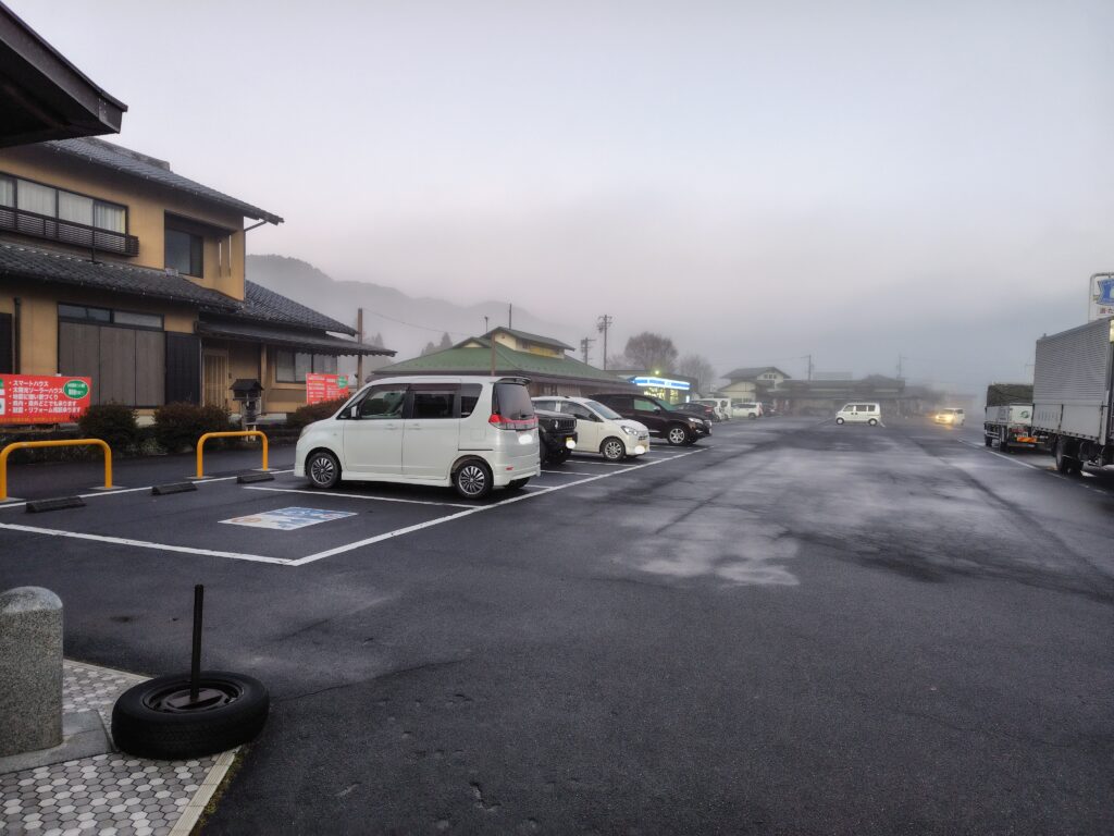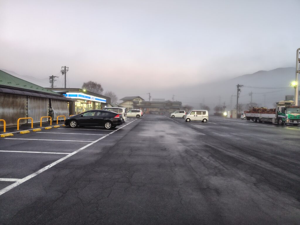 国道の走行音の影響はあるものの、ローソン付近かトイレ付近の駐車場が比較的車中泊しやすい場所になります。